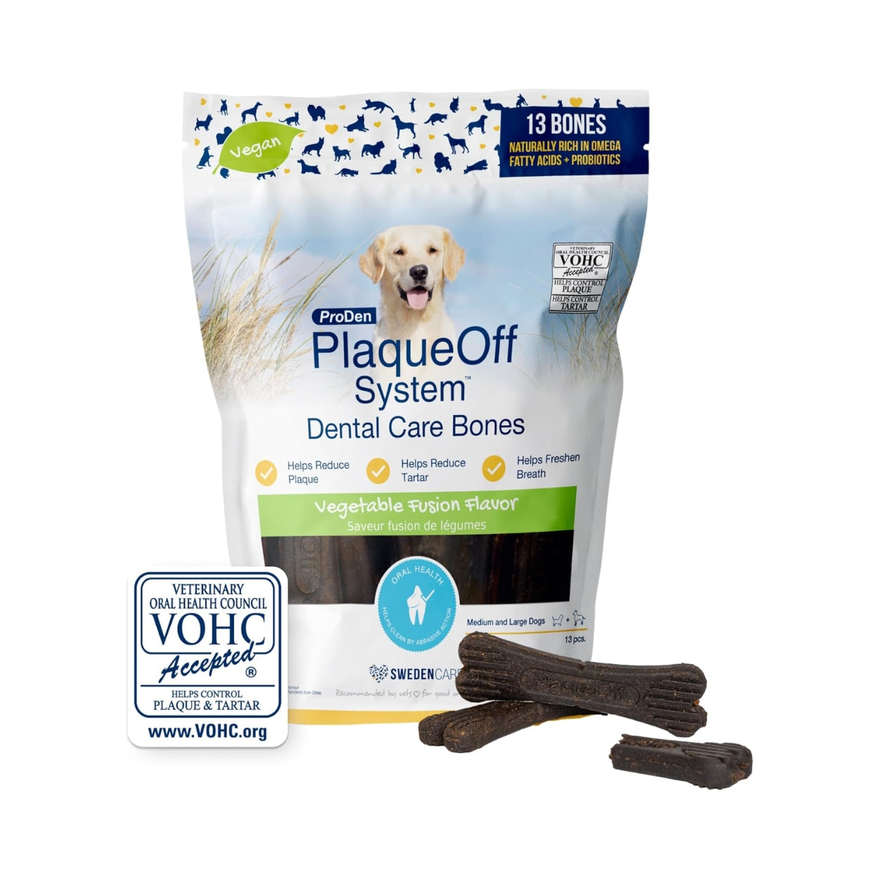 ProDen PlaqueOff Dental Bones for Medium & Large Dogs – Pack of 2, Vegetable Fusion flavor, offers a double supply of natural dental support. Designed for medium and large breeds, these crunchy bones help reduce tartar, plaque, and bad breath while encouraging chewing. The vegetable-inspired flavor keeps dogs engaged and makes oral care enjoyable. Regular use supports stronger teeth, healthier gums, and fresher breath. Perfect for multi-dog households or extended daily use.