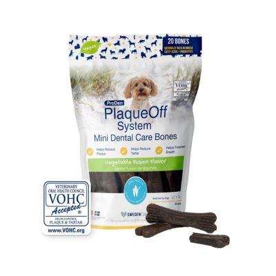 ProDen PlaqueOff Mini Dental Bones for Small & Toy Dogs – Vegetable Fusion flavor provide natural daily oral care for smaller breeds. The crunchy mini bones help reduce tartar, plaque, and bad breath while being gentle on tiny jaws. Made with wholesome, vegetable-inspired ingredients, they encourage chewing and support healthy teeth and gums. Regular use promotes fresher breath and long-term oral hygiene. A convenient and tasty solution to keep small dogs’ mouths clean and healthy.